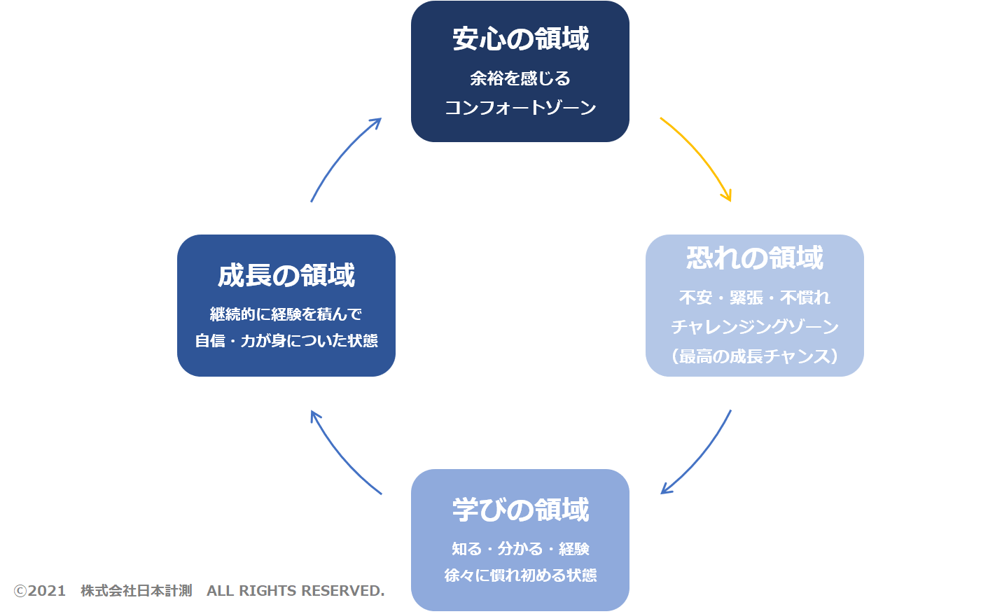 緊張、恐れ、不安などは自分がチャレンジをしている証拠です。(チャレンジングゾーン・怖れの領域)