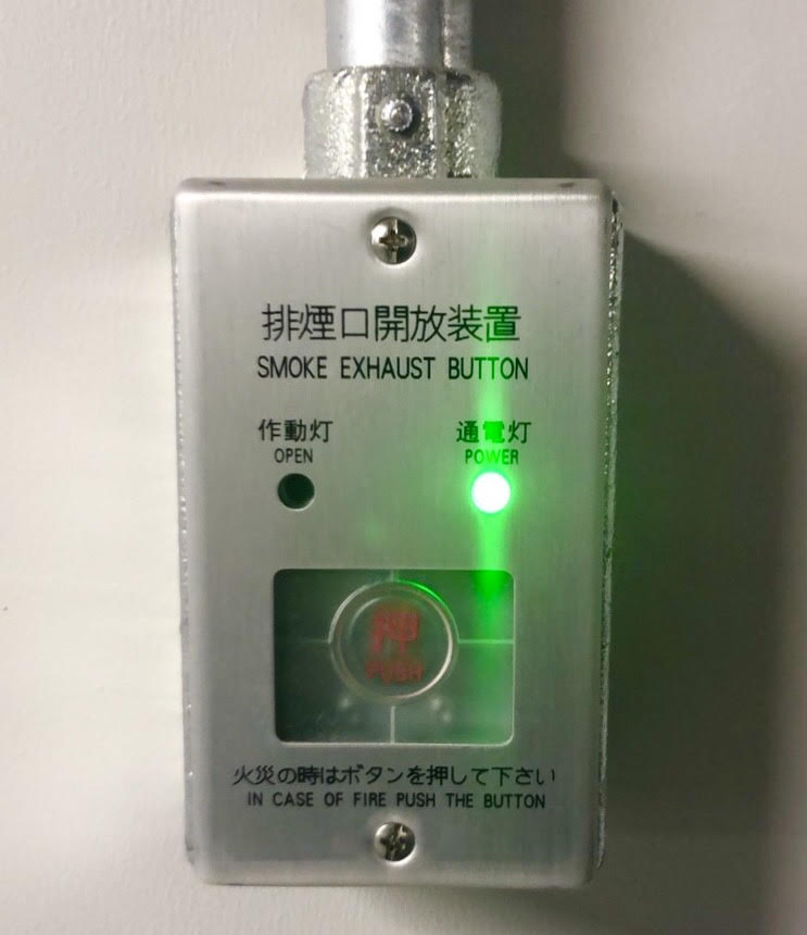 ※排煙口の風量測定を行うために、排煙口手動開放装置のボタンを押す、あっちゃん♪